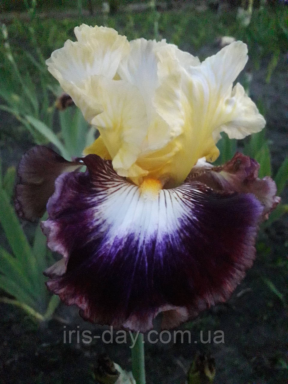 Стандарти яскраво жовті, з вливанням білих прожилок. Фоли білі, плавно перехідні в насичено червоно-фіолетову широкую окантовку з легкої чорної підсвіткою. Борідка – жовта. Неперевершений вроди квітка!