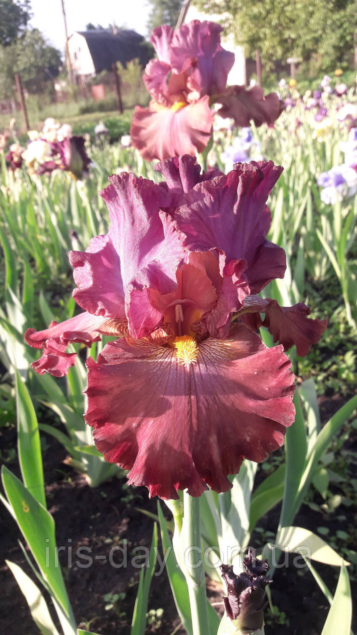 Ірис гофрований, хвилястий, вирізняється оригінальним відтінком. Стандарти — золотисто-бронзові, фоли кольору зрілої кориці з кораловим відливом, а борідка — мідно-вохряна.