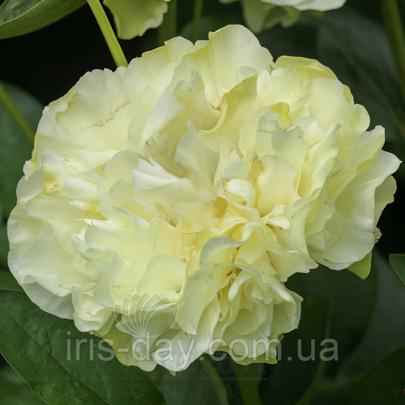 квіти напівмахрові або махрові на зрілих рослинах рожевої форми. Пелюстки лимонно-жовті, на стадії бутона зовнішні пелюстки мають салатовий колір (особливо в прохолодну весну). Під час цвітіння пелюстки широко відкриті, у центрі помітно трохи стамінодій того ж кольору та облямованих золотом. Зовнішні пелюстки кремово-жовтого кольору повільно бліднуть після цвітіння, а стамінодії можуть місцями чорнити. Пильники жовті зі світло-жовтими тичинковими нитками. Піск світло-зелений обвушений із блідо-рожевими ривцями.